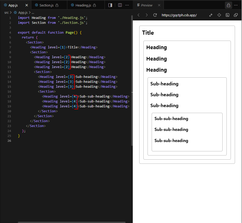 codesandbox 링크로 접속하시면 지금은 각각의 <Heading> 컴포넌트에 level prop을 전달하고 있고 다음과 같이 코드를 수정하려고 합니다.