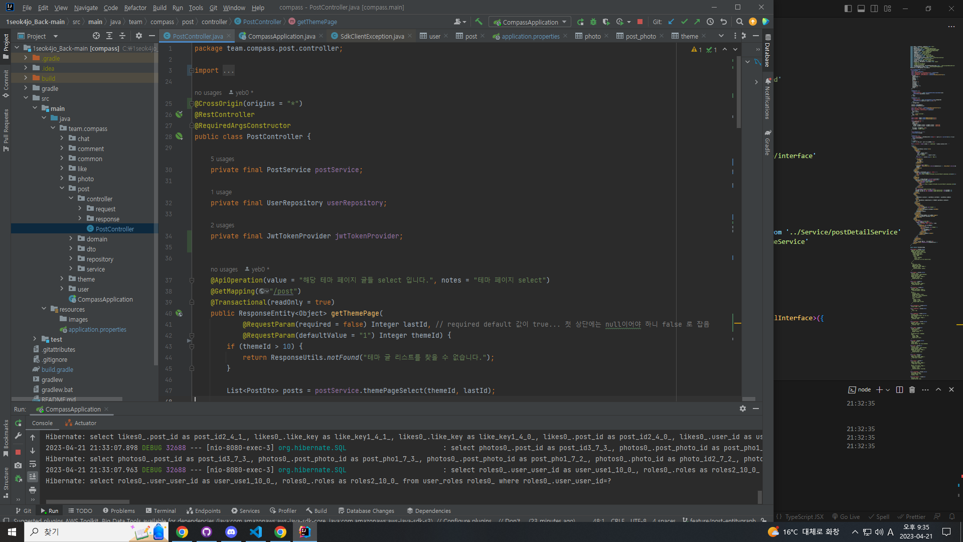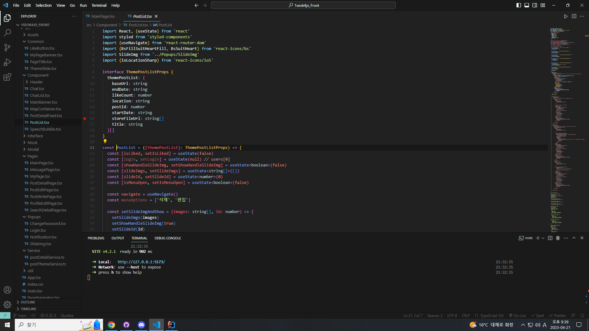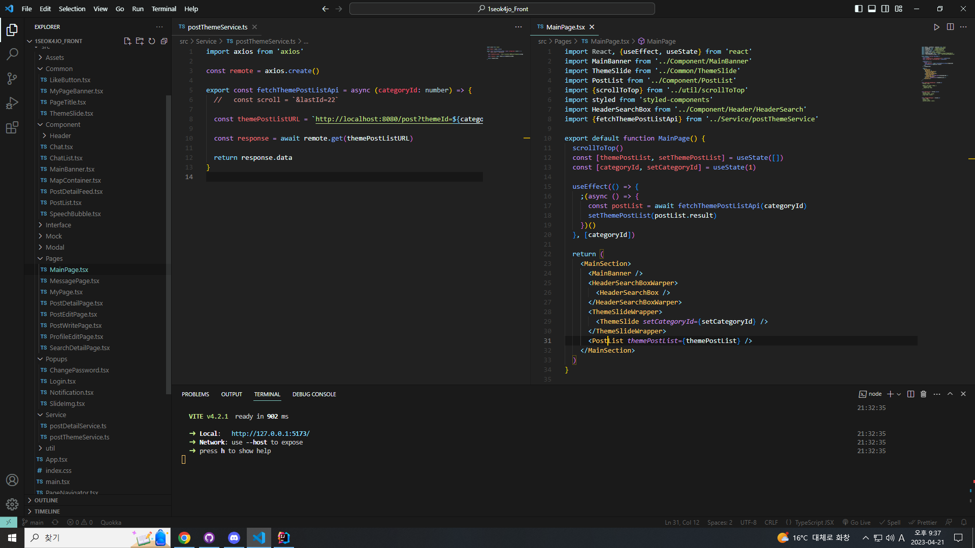 선택된 Theme을 ThemeSlide에서 onClick event가 발생할 때마다 전달받아서 useEffect hook을 사용해서 postList를 받아왔습니다. 그 후 postList배열을 state로 선언해 두고 PostList Component에 Props로 전달해 주었습니다.