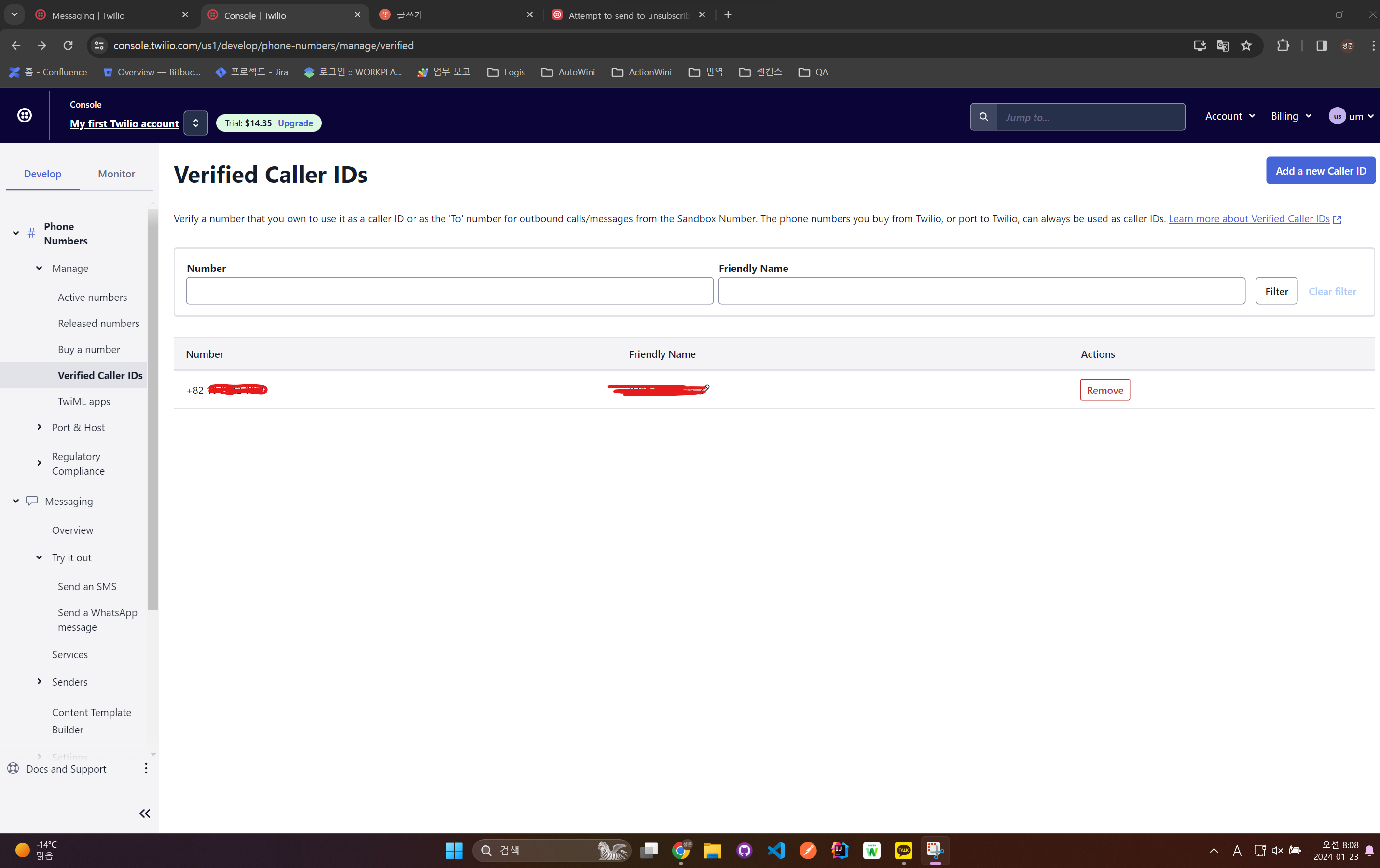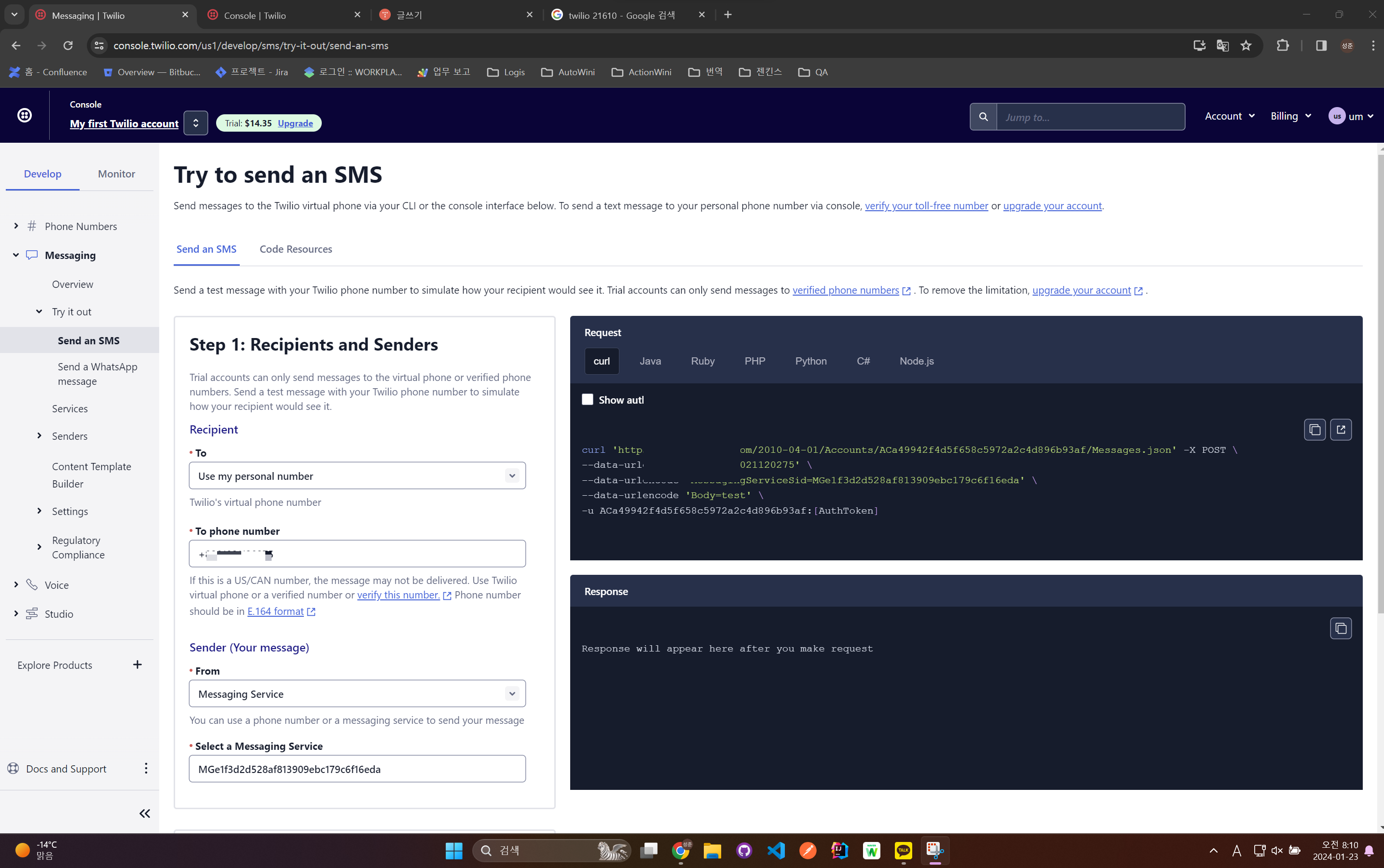 Verified Caller IDs 탭에 들어오셔서 평가판 계정일 경우 허용된 번호를 등록하시면 정상적으로 메시지를 보낼 수 있습니다.